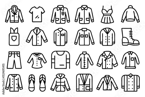 Collection of line icons depicting clothing items such as shirts jackets and coats isolated on transparent background