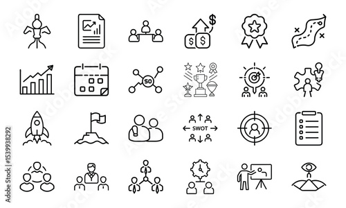 Collection of line icons representing business strategy planning and development a comprehensive set of icons for various business concepts