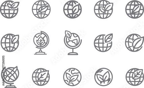Collection of linear gray icons depicting Earth with leaves, nature and sustainability themes
