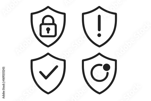 Collection of linear shield icons for security and data protection. Set of simple vector symbols for web and app design. Notification bell, checkmark, and alert signs concept.