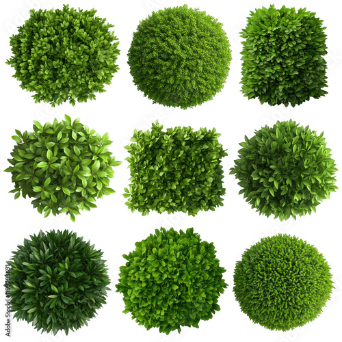 Collection of Lush Green Shrubs, Aerial View of Various Shapes and Sizes, Isolated on White Background Cutout