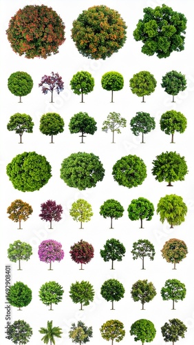 Collection of Lush Green Trees Top View Isolated on White Background.