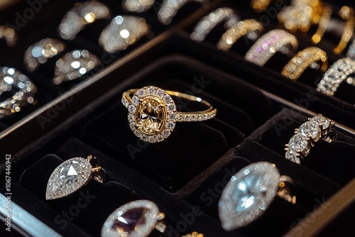 Collection of Luxury Jewelry Rings and Necklaces in Elegant Display Case. AI generated illustration