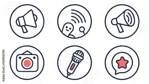 Collection of media related symbols including megaphone, wifi, camera, microphone and star icon