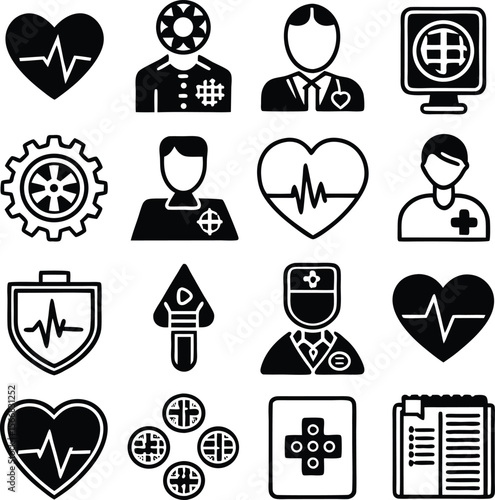 Collection of medical and healthcare icons featuring hearts doctors monitors and diagnostic symbols for health services