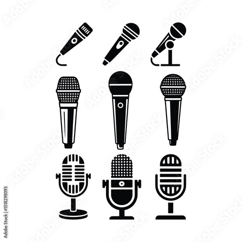 Collection of Microphone Vector Icons – Retro and Modern Audio Equipment Silhouettes for Music, Podcast, and Broadcasting Design