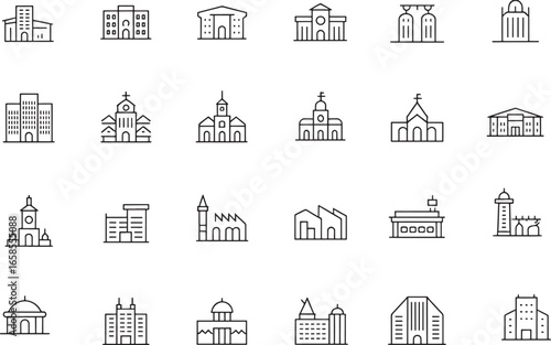 Collection of Minimalist Building Icons Representing Architecture and Urban Design Concepts for Web and Graphic Design Projects with Line Art Style