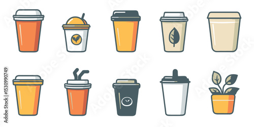Collection of minimalist flat vector illustrations of beverages and plants in variety of cups and containers for design purposes