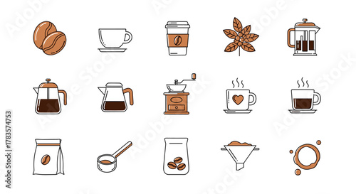 Collection of minimalistic thin line icons representing various coffee-related elements, including coffee beans, cups, a French press, a coffee grinder, a coffee plant, a takeaway cup, a coffee bag