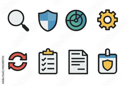 Collection of modern flat icons representing business, technology, and security concepts, including a magnifying glass, shield, radar, gear, refresh arrows, checklist, document, and badge with shield