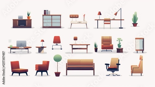 Collection of Modern Home and Office Furniture Illustrations Featuring Stylish Desks, Chairs, Cabinets, Plants, and Accessories in a Minimalist Design