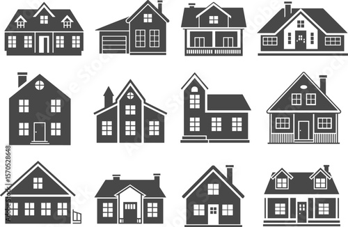 Collection of modern house icons, residential buildings, black silhouette home designs, architecture clipart, vector set, real estate illustration
