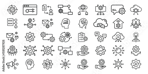 Collection of modern technology and business process line icons with gears and abstract elements