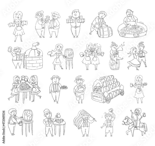 Collection of monochrome illustrations of oktoberfest in sketch style. Hand drawings in art ink style. Black and white graphics.
