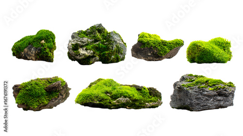 Collection of moss-covered natural rocks isolated on white background.