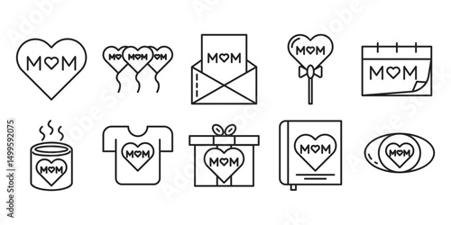 Collection of Mother’s Day themed icons including hearts, gifts, and love elements for festive design needs.