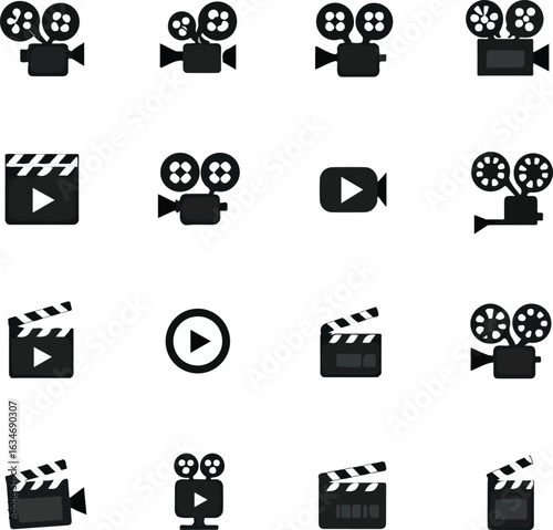 Collection of movie cameras and film clapboards simple icon illustrations with transparency