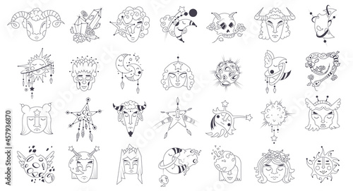 Collection of mystical and mysterious illustrations in hand drawn style. Mystical signs, silhouettes, zodiac signs. Astrological and magical elements are isolated on a white background. Astronomy