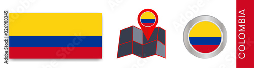 Collection of national flags of Colombia isolated in official colors and map icons of Colombia with country flags.