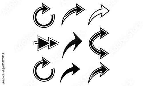Collection of nine black and white arrow icons with various styles including curved circular and fast forward symbols on a clean white background