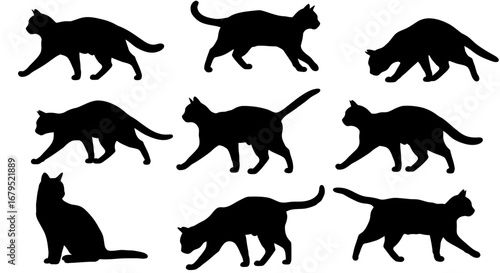 Collection of nine black cat silhouettes in various playful and graceful poses on a white background