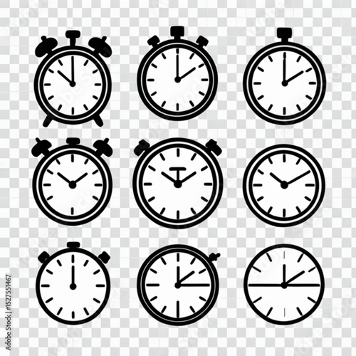 Collection of nine clock and timer icons showing different times in black and white illustration style created with generated ai