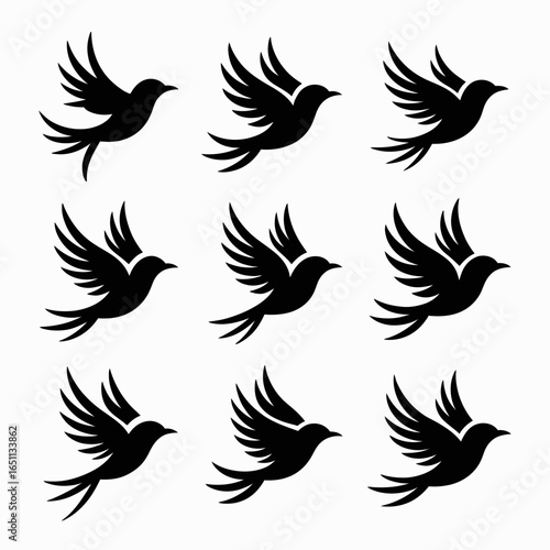 Collection of nine elegant black bird silhouettes in flight isolated on white background silhouette