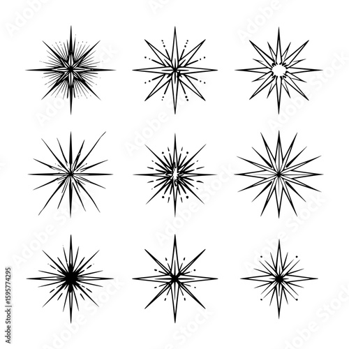 Collection of nine hand drawn black and white starbursts with varied line weights and design elements