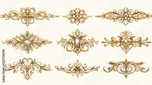 Collection of nine ornate gold and diamond decorative elements. Intricate floral designs and swirling patterns, isolated on a white background
