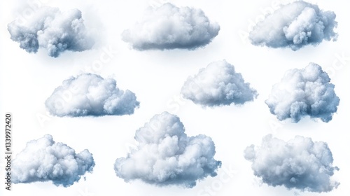 Collection of Nine Realistic Cumulus Clouds Isolated on White Background