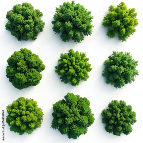 Collection of nine rich green treetops, aerial view on white background. Diverse foliage, leafy crowns, branches forming organic patterns. Vibrant natural elements for eco designs, landscaping