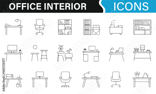 Collection of Office Interior Icons Including Desk, Chair, and Storage