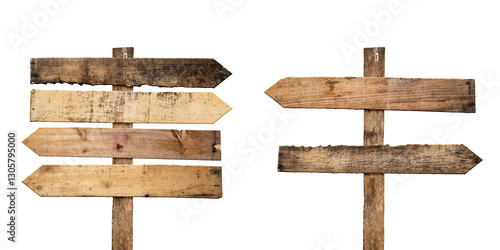 Collection of old various wooden road directional signposts with different arrow directions isolated over a white background. Mockup or copy space