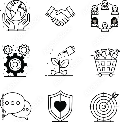 Collection of outline icons representing business, environmental, and social concepts