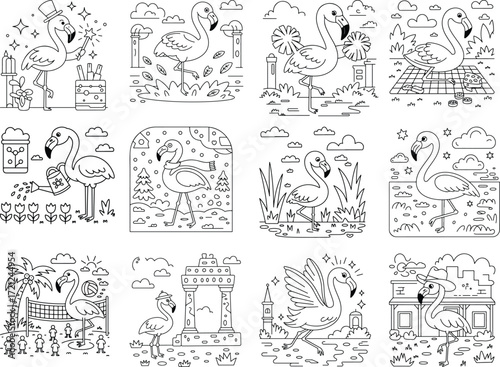 Collection of outline illustrations featuring cartoon flamingos engaged in diverse activities and poses on a white background isolated on white background
