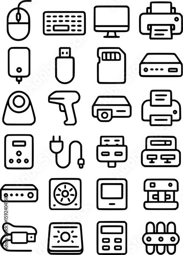 Collection of outlined computer hardware and peripheral icons arranged in a grid.