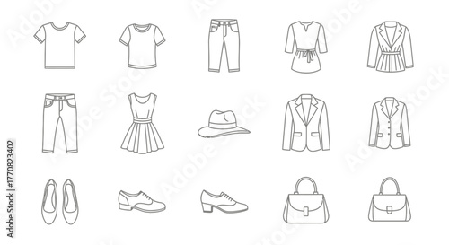 Collection of outlined fashion items: shirts, pants, dress, hat, shoes, jackets, and handbags arranged in rows.