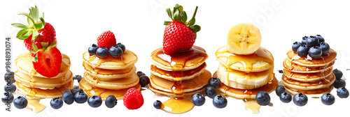 Collection of pancake stack, banana, strawberry, raspberry, blueberry fruits on withe