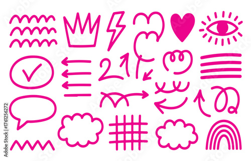 Collection of Pink Hand Drawn Doodle Icons and Symbols Keywords: abstract, arrow, art, bubble, check, cloud, crown, doodle, drawing, element, eye