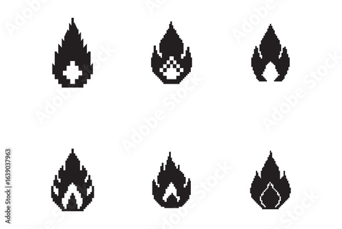 Collection of Pixel Art Flames Icons in Black and White for Digital Design and Creative Projects