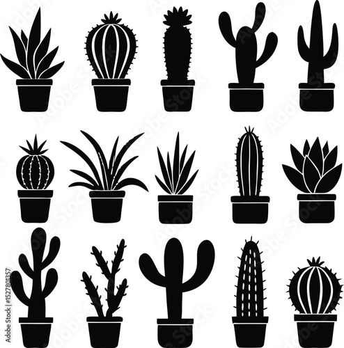 Collection of potted succulents and cacti in black silhouette illustrations