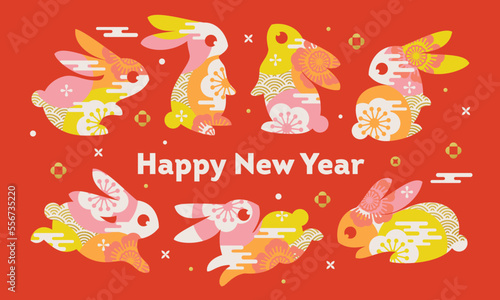 Collection of rabbits. Cute bunnies with decorative elements on red background. Chinese new year 2023 greeting card with lunar zodiac symbol of rabbit for traditional chinas holiday spring festival