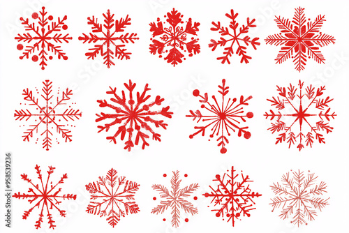 collection of red snowflakes arranged in rows, featuring different intricate patterns and designs against a white background