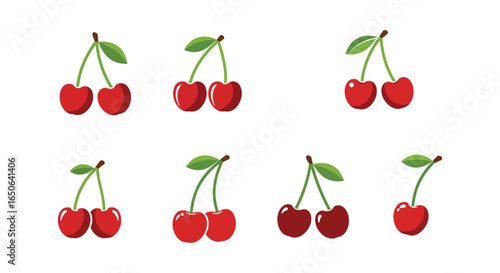 Collection of Ripe Cherry Pairs with Stems and Leaves Illustration