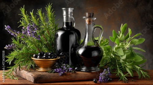 Collection of Rosemary and Sage Herbal Oils Displayed with Fresh Herbs on Rustic Wooden Surface