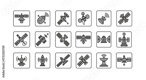 Collection of Satellite Icons - Space Technology and Communication.