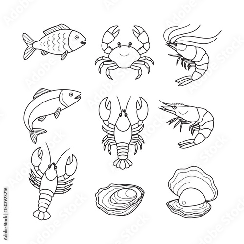 Collection of Seafood Line Drawings Fish, Crab, Shrimp, Lobster, Oyster Illustrations