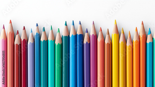 Collection of sharpened colored pencils standing upright in a row on a white background.