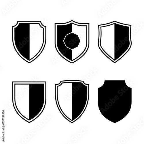 Collection of shield icons with black and white halves and a soccer ball silhouette isolated on white background