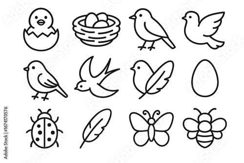 Collection of simple bird and insect line icons including nest, eggs, and feathers